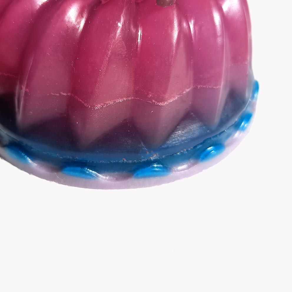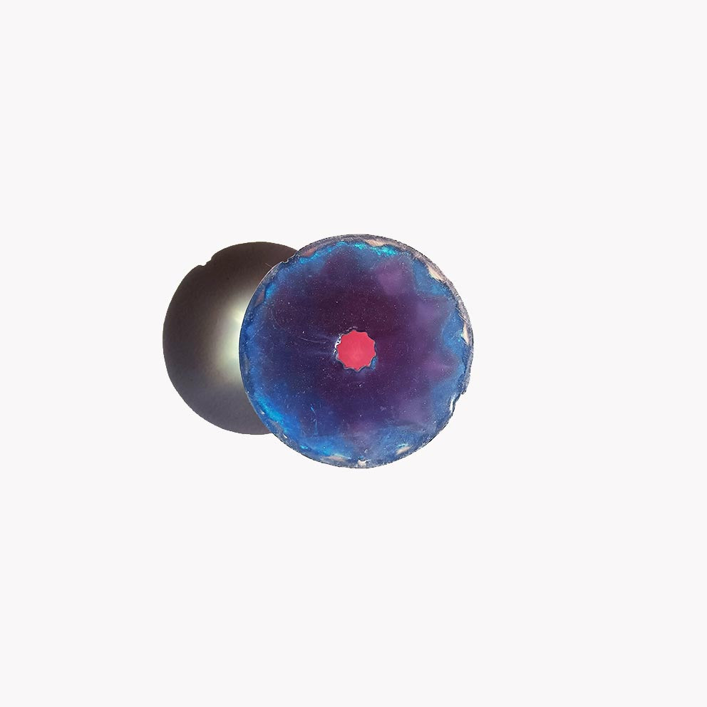 A mesmerizing fusion of deep indigo, ocean blue, and violet hues, crowned with a radiant red center. Its translucent surface evokes the look of polished geode or cosmic stone, making it feel like you're holding a slice of a galaxy in your hand.
