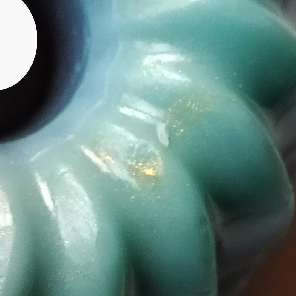A sculpted, swirl shaped soap with rich turquoise tones and a glossy finish and looking like a colourful pastry with some gold and some nice blends of color
